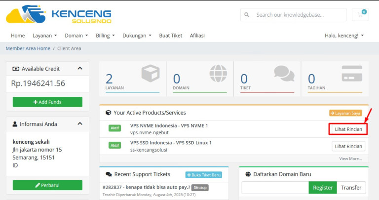 di Member Area Kenceng Solusindo - Setelah itu masuk ke dashboard member area Kenceng Solusindo, daftar layanan yang aktif langsung tertampil di halaman utama member area. Klik LIhat Rincian pada salah satu layanan VPS