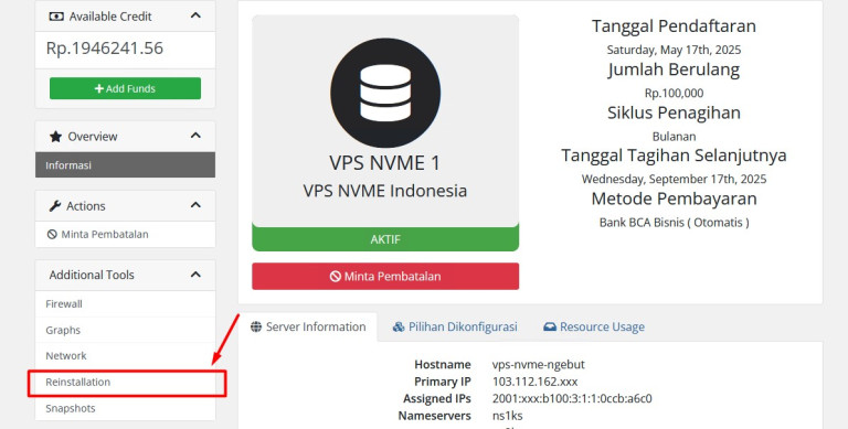 - Setelah masuk ke rincian layanan VPS, klik Reinstallation untuk memulai menginstall sistem operasi baru